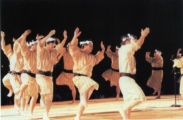 人々の歌声と力強い足拍子だけで踊るのが本来のスタイルで、円陣を組んで全員で歌い踊ります。