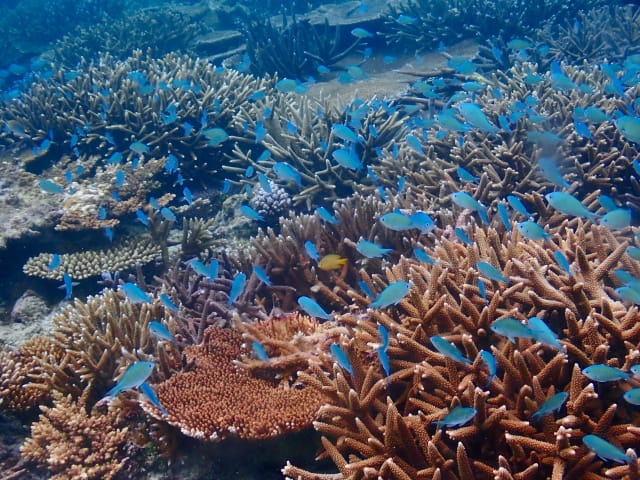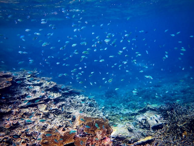 リーフが存在するからこそ、宮古島の海では色とりどりの魚が集まる光景が見られます。
