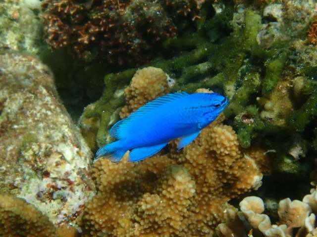 深い青色が印象的なスズメダイの仲間で、宮古島の海でもよく見られる魚です。