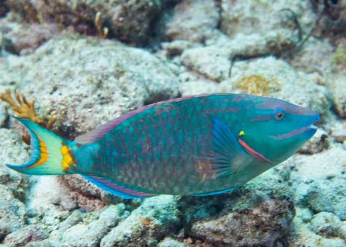 大きな体と青緑色の美しい体色が目を引く大型の魚で、宮古島の海でも存在感があります。