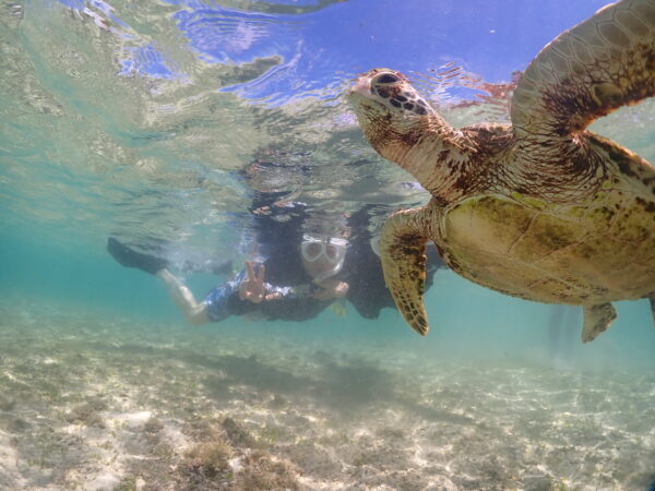なんと、海に入って数分後に早速ウミガメとの遭遇!私たちの近くで、元気に泳いでいるウミガメを発見しました。